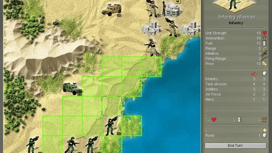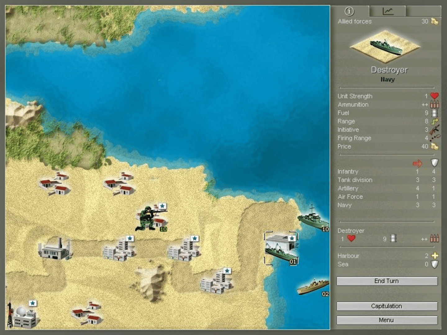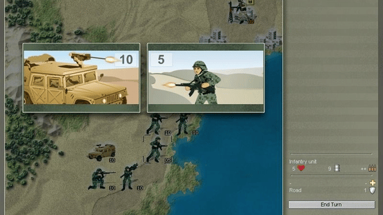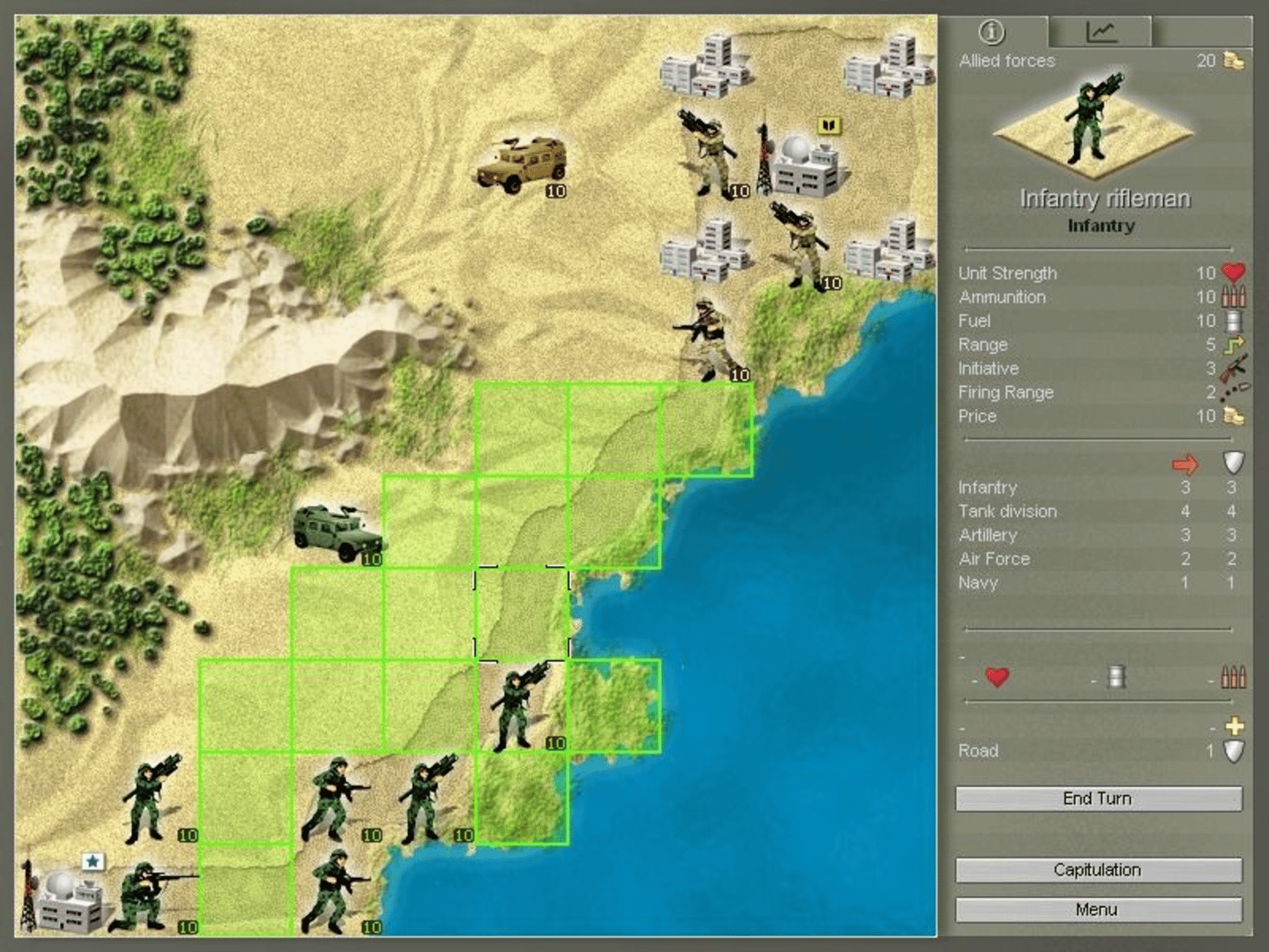Your army is close before capitulation. As commander in chief of the allied forces you have to make a counterattack. This Adobe Flash based game offers simple turn-based strategical action. On the map you move your units which can be infantry, tanks, artillery, air force and naval forces. Most of them are able to attack ranged, so no automatic counterattack happens. Different terrain types provide attack and defense bonuses. Buildings and cities can be conquered by infantry only. Conquered cities provide cash for new units, which can be bought at military facilities. In order to win either all enemy units must be destroyed or the enemy base must be liberated by infantry. Game modes are "free game", played on a chosen map, a 10 mission campaign or a multiplayer game with online high scores.