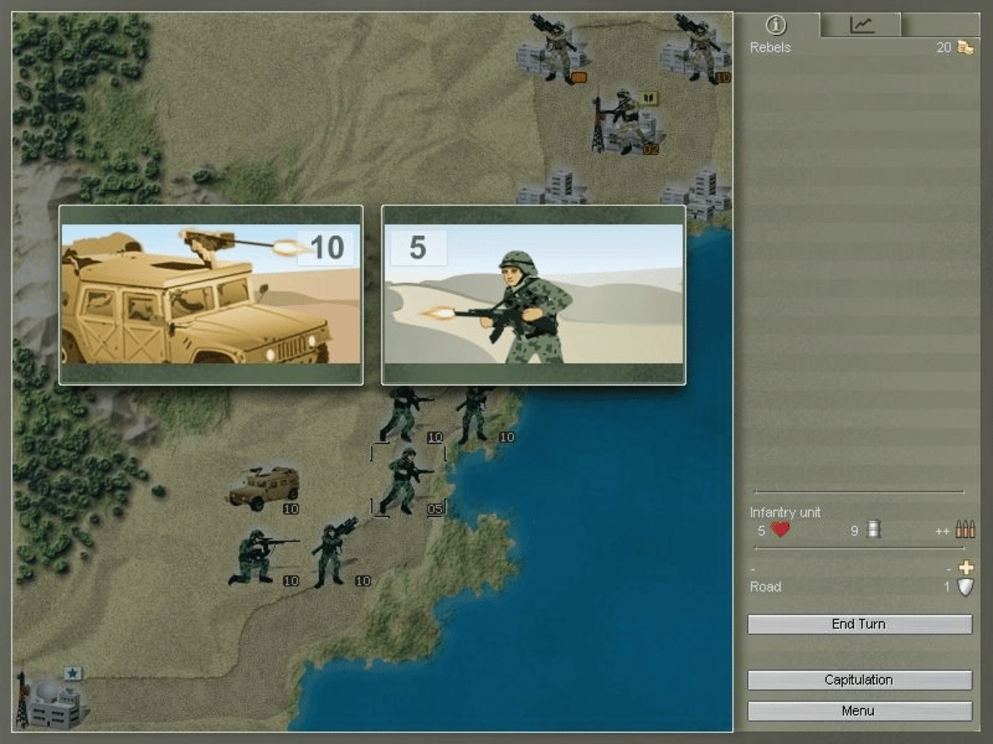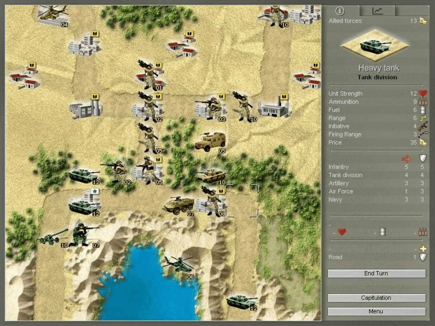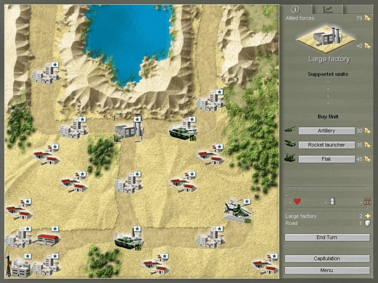 Your army is close before capitulation. As commander in chief of the allied forces you have to make a counterattack. This Adobe Flash based game offers simple turn-based strategical action. On the map you move your units which can be infantry, tanks, artillery, air force and naval forces. Most of them are able to attack ranged, so no automatic counterattack happens. Different terrain types provide attack and defense bonuses. Buildings and cities can be conquered by infantry only. Conquered cities provide cash for new units, which can be bought at military facilities. In order to win either all enemy units must be destroyed or the enemy base must be liberated by infantry. Game modes are "free game", played on a chosen map, a 10 mission campaign or a multiplayer game with online high scores.