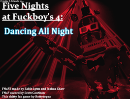 Ever wondered what would happen if the creator of the (s)hit fan games Golden Freddy's Debauchery Simulator and FNaFB SFME decided to make a fan made Five Nights at F---boy's 4 and not take it seriously in the slightest? Five Nights at F---boy's 4: Dancing All Night is the answer to your weirdly specific question!