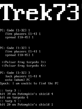 Trek73 is a computer game based on the original Star Trek television series. It was created in 1973 by William K. Char, Perry Lee, and Dan Gee. The game simulates battles between space ships of the Star Trek franchise. Through text commands, a player may order the ship to perform certain tasks in battle against an opposing vessel.