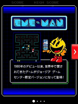 Eme-Man is a Pac-Man game released in 2017 on the Japanese Coca-Cola app; it promotes the Georgia European line of coffee products. Gameplay is almost identical to the original Pac-Man, but the Ghosts are slower, Fruits are coffee products, Power Pellets are coffee beans, Pac-Dots are red, and the maze is a shade of cyan (identical to Pac-Man Plus's maze color).