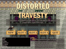 Distorted Travesty is a fast paced action platformer with a focus on combat. You play as Jerry, a hardcore gamer who doesn't game too often anymore due to having a very boring and time consuming job. That is until he and his long time hacker friend, Jeremy, are suddenly sucked into a video game world while raiding someone's Second Life corporate building. Hey, he said their favorite game was horrible, he had it coming! Now they must use their gaming knowledge in an attempt to free themselves from this unknown, yet very familiar world.