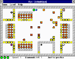 Kye is a real-time puzzle game with a variety of interacting objects. It takes ideas from puzzle games like Sokoban and Boulder Dash, but the inclusion of active objects gives it a real-time component, and it can also produce arcade-game levels like those found in Pac-Man. Anyone can create new levels for the game.