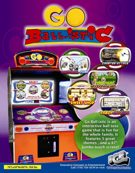 Go Ballistic is a video redemption game requiring the players to physically move around by tossing soft play balls at an interactive touch screen. It includes five mini-games to choose from, each with distinct themes and missions. There is no restriction on the number of balls per game, so players can toss as many balls as they like within the time limit.