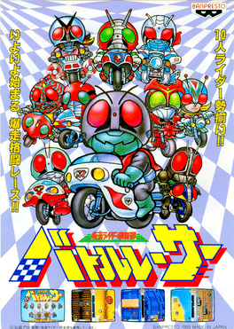 Masked Riders Club: Battle Race is a top-down action racing game based on the Kamen Rider television franchise. The game consists of nine vertically-scrolling levels that need to be completed before time runs out, with themes such as an industrial environment, a beach, a snowy environment etc., each with its own enemies. At the start the player chooses one of ten superhero Kamen Riders (Rider 1, Rider 2, Rider V3, Riderman, Rider X, Amazon, Stronger, Super1, Rider 2X or Black RX). The riders are grasshopper-themed altered humans and each come with his own motorcycle rated in three different statistics as well as a unique weapon such as a blade, a hook, a short burst of fire, or a pole.