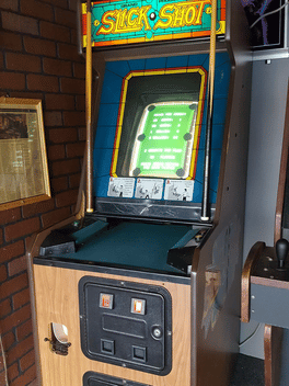 Slick Shot is a 1990 billiard arcade game developed and produced by Grand Products. Players choose one of two billiard games: Slickshot or 9 ball. Using a real cue stick and ball on a small pool table surface, a player must shoot the ball into the game cabinet to simulate the shot on the video screen. Infrared sensors on the table slate calculate the speed and direction the ball is traveling.