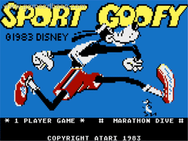 An unreleased prototype for the Atari 5200. You take control of goofy as he competes in two events, the Marathon Dive and the Pogo Pop. The Marathon Dive is a game in which you must guide Goofy up a series of platforms so he can reach the diving platform and jump off before the timer runs out. As Goofy climbs up the platforms he must avoid little armored tanks, which will chase Goofy around. Thankfully these tanks can't jump, reverse direction, or use the ladders, so they can be avoided by jumping over them or leading them into a hole (which will cause them to fall down to the next level). Also hindering Goofy's progress are large gaps in the platforms which must be carefully jumped over. If Goofy falls through a hole he'll fall down one level but is otherwise unharmed, however if he is hit by a tank he'll loose a life. If Goofy makes it to the top of the platform he will run off the end, making it about halfway across the screen before realizing that he's running in mid-air. Now Goofy will begin to fall, and you