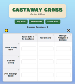 Castaway Cross is a daily logic game inspired by Survivor and Immaculate Grid. Connect players across seasons, twists, and eras using strategy, memory, and a bit of intuition. Built for fans who love the details.